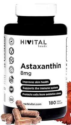 Astaxantina pura 8mg procedente de 160mg de Alga Natural Haematococcus Pluvialis al 5% en Astaxanthin. 180 cápsulas veganas para 6 meses. Antioxidante celular para mejorar la piel y el sistema inmune.