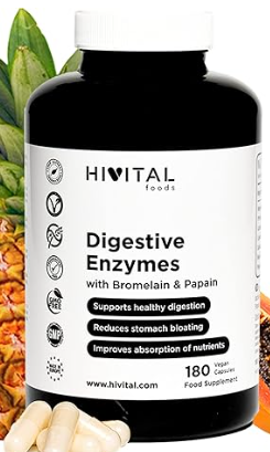 Enzimas Digestivas. 180 cápsulas veganas para 6 meses. Amilasa, Proteasa, Lactasa, Lipasa, Celulasa, Bromelina y Papaína. Para mejorar la digestión y reducir la hinchazón estomacal