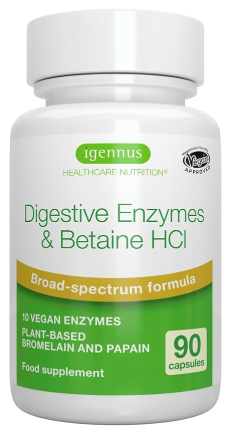 Enzimas Digestivas con Betaína HCl y Bromelina, 10 Enzimas Veganas que Incluyen Papaína y Lipasa, Clorhidrato de Betaína, Suplemento de Etiqueta Limpia, 90 Cápsulas, de Igennus