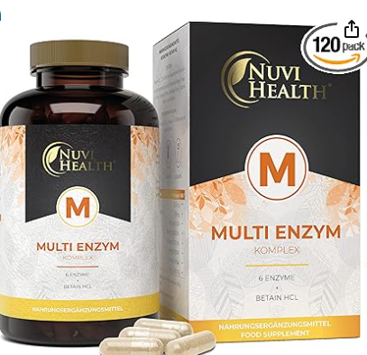 Enzimas digestivas – Complejo completo con 6 enzimas + Betaína HCL – Con bromelina, papaína amilasa, catalasa, lipasa – Altamente dosificado – Vegano – 120 cápsulas con recubrimiento entérico