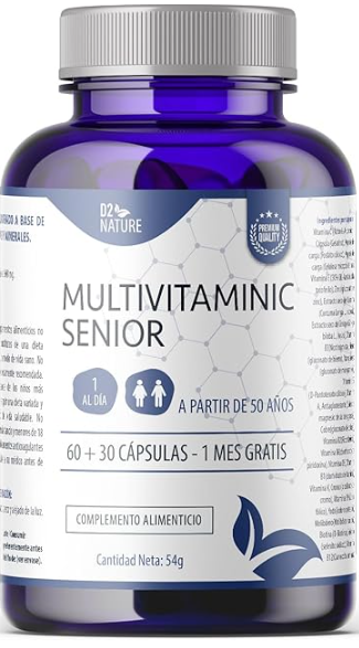 Multivitamínico Senior – Mayores de 50 Años – Vitaminas C D3 E B12 – Cúrcuma – Ginkgo Biloba – Zinc – Hierro – 90 Cápsulas – Salud Ósea Cognitiva – Inmunidad – Energía – Antioxidantes | D2 Nature