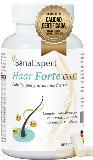 SanaExpert® Haar Forte Gold | Suplemento Capilar Vegano para Fortalecer el Cabello – Pastillas con Vitaminas, Bambú, Melanina, Biotina y Zinc – 60 Cápsulas – Fabricado en Alemania