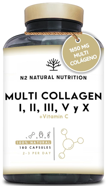 Multi Colágeno Hidrolizado Puro 1650mg + Vitamina C 53mg. Colágeno Tipo I, II, III, V y X. 180 capsulas. Favorece la Salud de Piel, Cabello, Huesos y Articulaciones. N2 Nautural Nutrition.
