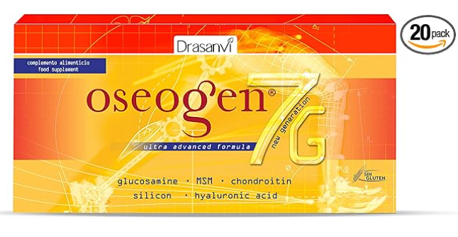 Drasanvi OSEOGEN 7G con Cissus Vitis, Condroitina, Glucosamina, MSM y Cúrcuma para Huesos, Cartílagos y Articulaciones,ayuda en la Regeneración de Tejidos Dañados, 20 Viales = 20 Días, Sabor Naranja