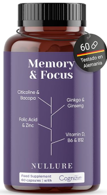 Nullure Nootrópico Potente | Memoria y Concentración | Energía | Vegano | Ginko Biloba 6000 mg + Citicolina COGNIZIN + Ginseng + Bacopa Monnieri + Zinc + Vitamina D | Sin Cafeína | 60 caps