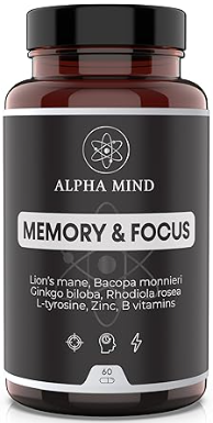 Alpha Mind – Nootropico Potente Natural – Sin cafeína – Concentración, Memoria, Agilidad mental – Con Melena de Leon, Bacopa Monnieri, Ginkgo biloba, Rhodiola Rosea, L tirosina, Zinc, Vitaminas B